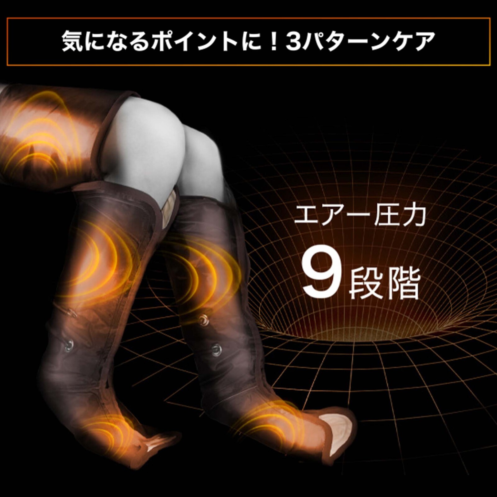 エアー圧力の強弱を最大9段階から自由に調節することが可能で、太もも、ふくらはぎ、足先に交互にエアー圧力入ることで、脚全体をリズムよく絞り上げることができ、負担のかかっている脚を素早くケアできます。