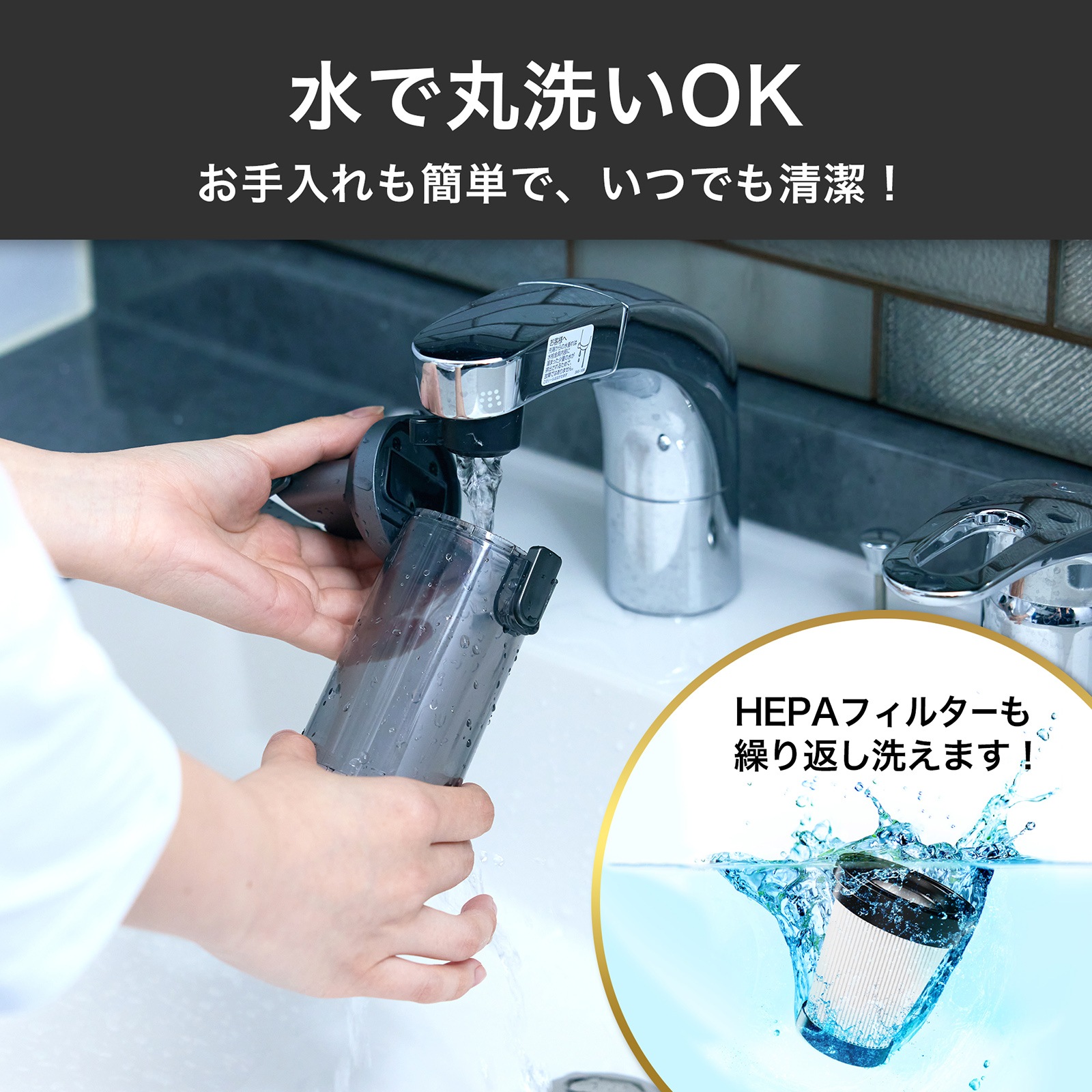 ダストカップ、メッシュフィルター、HEPAフィルター、隙間ノズルは水洗いが可能です。水洗い後、1日程度乾燥させてから、ご使用ください。